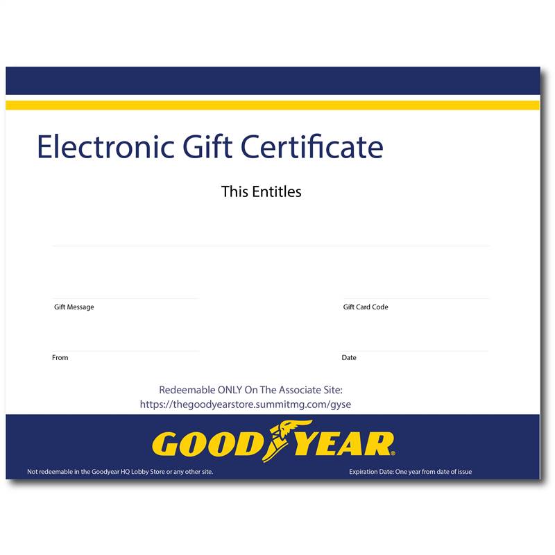 Gift Certificates to the Goodyear Associate Store website are easy to give and are always well received. Gift Certificates are electronic. A paper certificate will not be sent. **This item is non refundable and cannot be cancelled